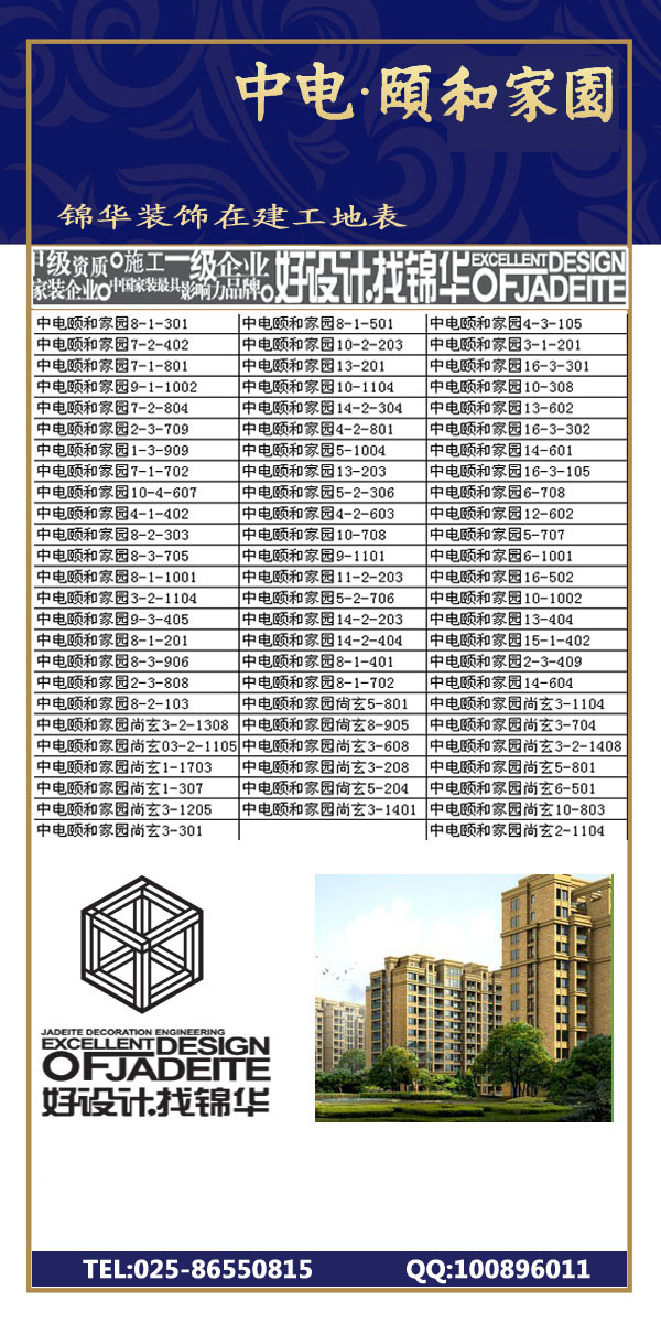 為了更好的讓中電頤和家園的業主了解錦華裝飾的整個工藝流程,錦華裝飾鼓北片區分公司整理了所有中電頤和家園的完工及在建工地,歡迎大家來參觀。